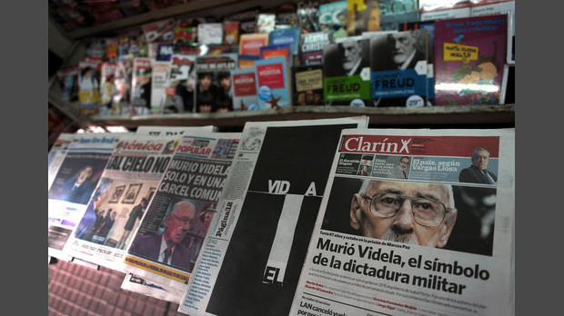 The front pages of major newspapers in Argentina reflect the news of the death of Jorge Rafael Videla, May 18, 2013